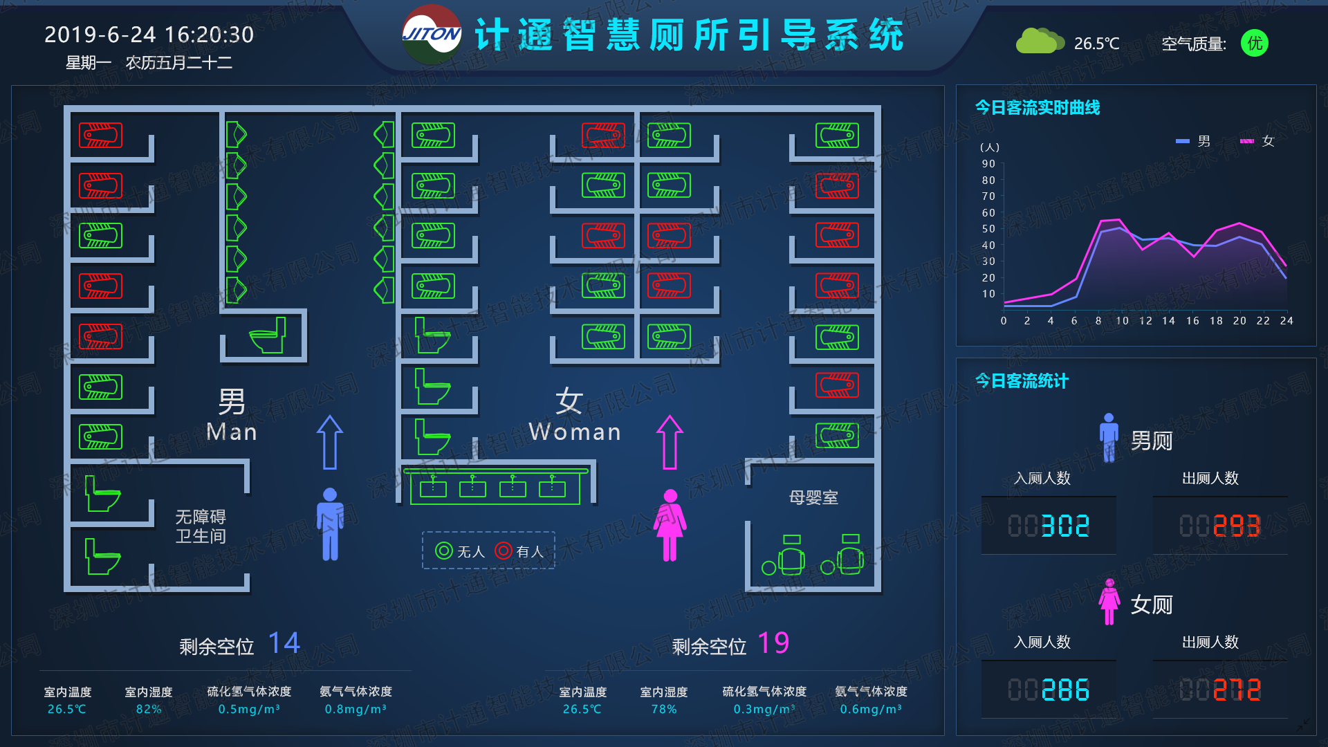 3、蹲位监测:动态监测厕位占用情况,可通过指示灯/屏实时显示;