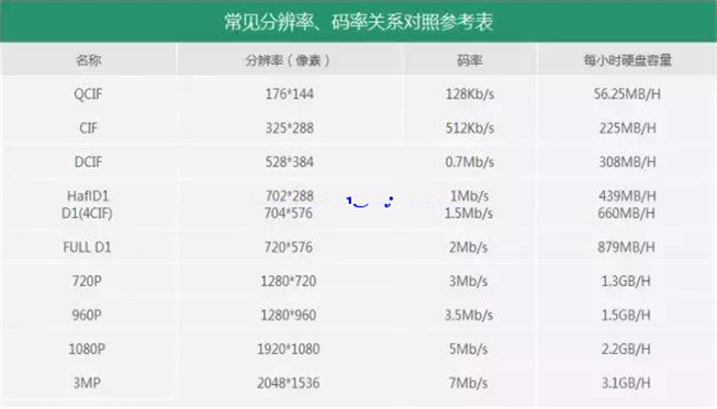 说到计算,我们要拿什么来计算呢?除了摄像头数目、需要录像的时间外,还有一个重要的数值:码率! 一般情况下,分辨率越大,码流呢也就越大,比如我们常用到的130W的摄像头,码流是2MB/S,也就是2048kbps。然后知道了码流、时间、通道数,我们就可以直接套用公式计算了。