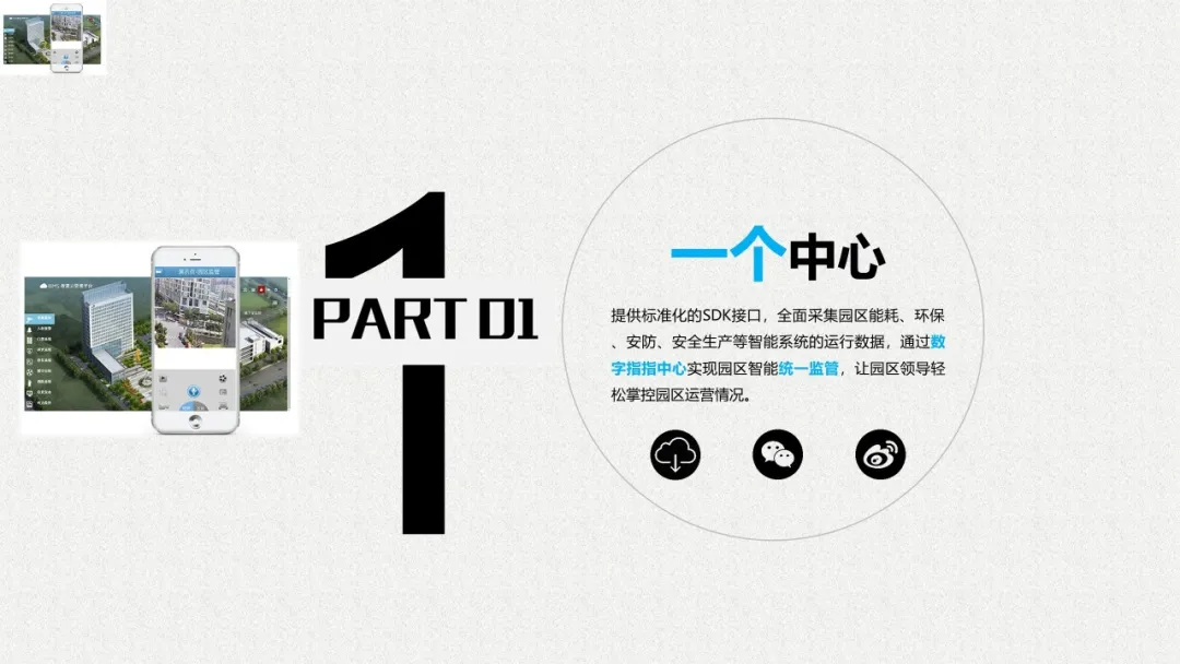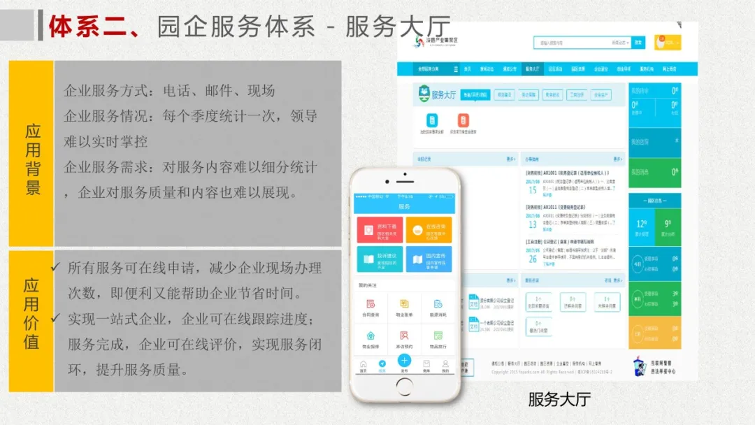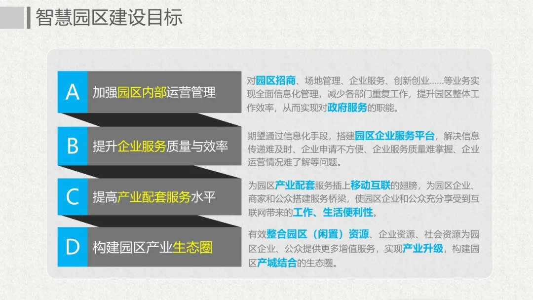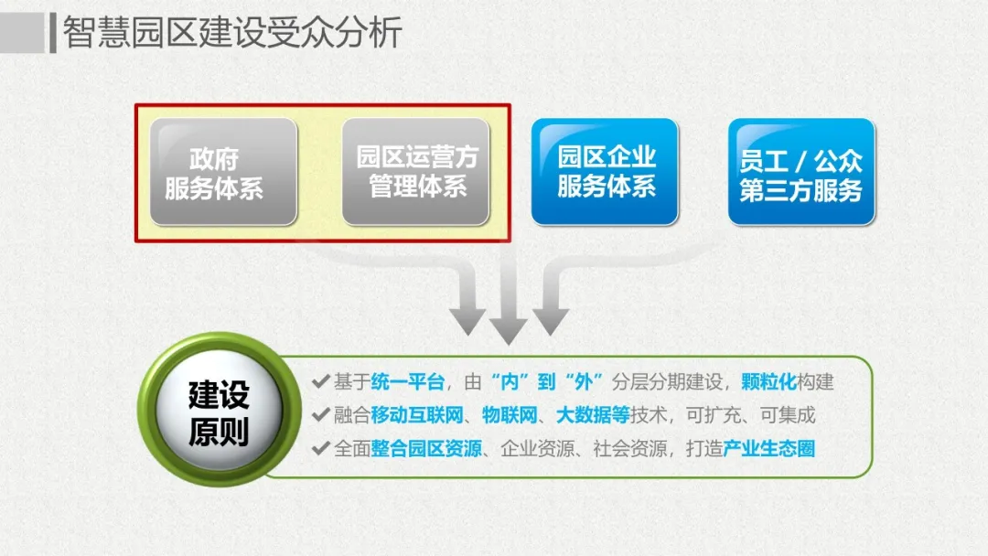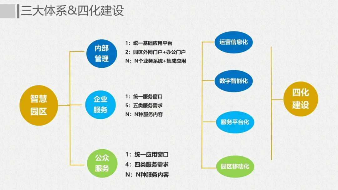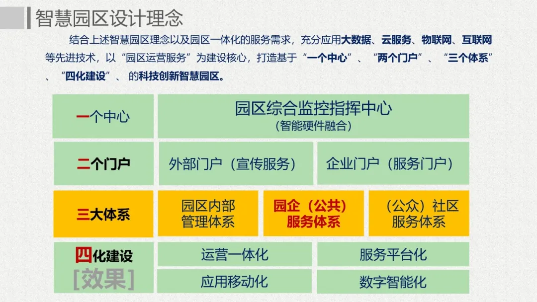 智慧园区理念以及园区一体化的服务需求,充分应用大数据、云服务、物联网、互联网等先进技术,以“园区运营服务”为建设核心,打造基于“一个中心”、“两个门户”、“三个体系”、“四化建设”的科技创新智慧园区。