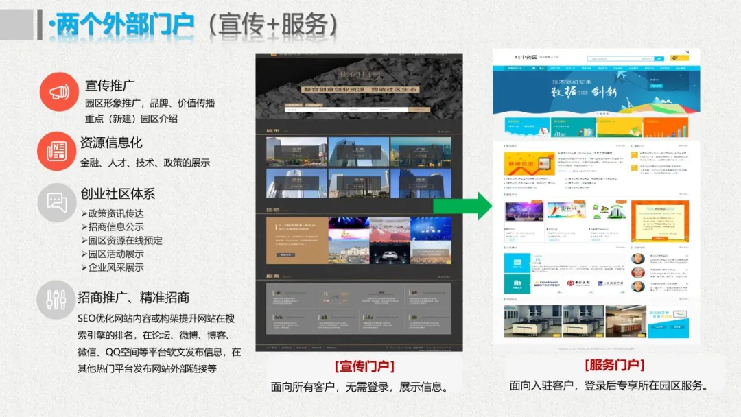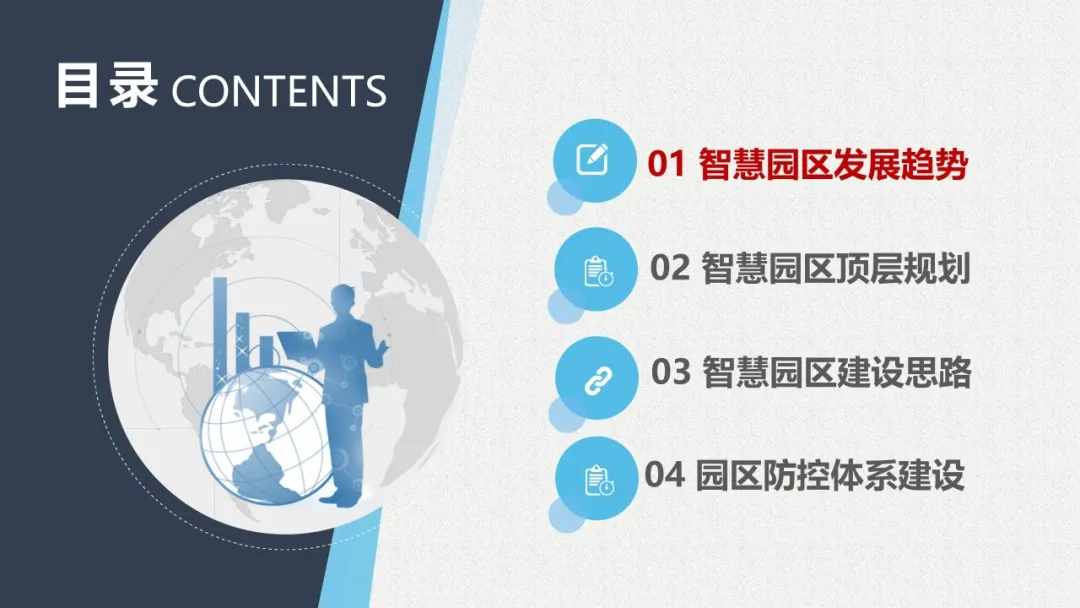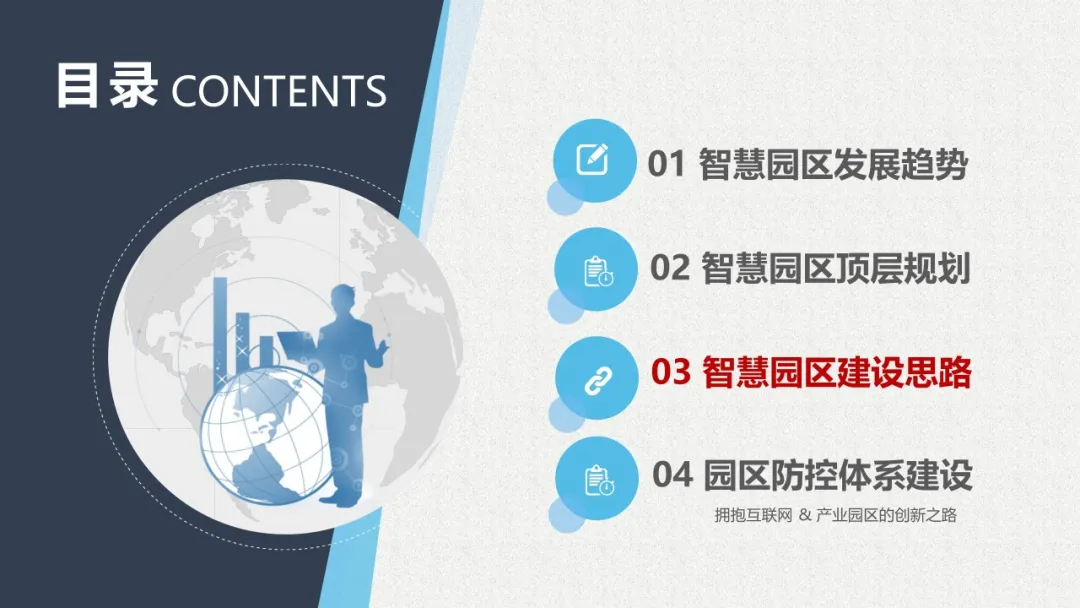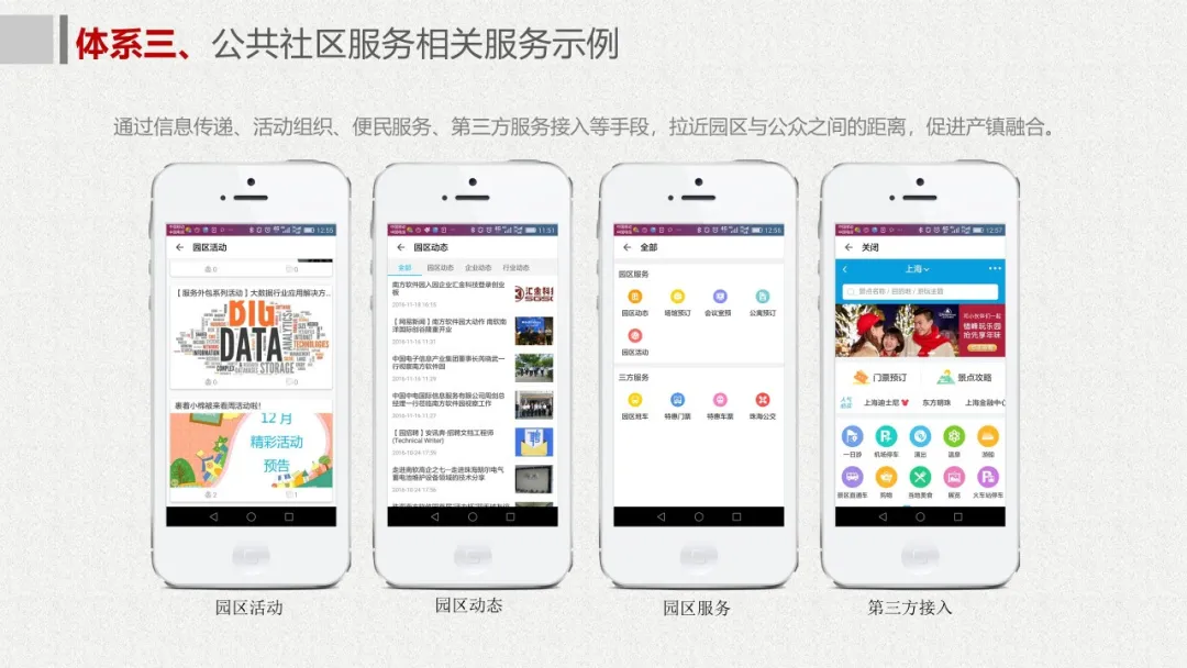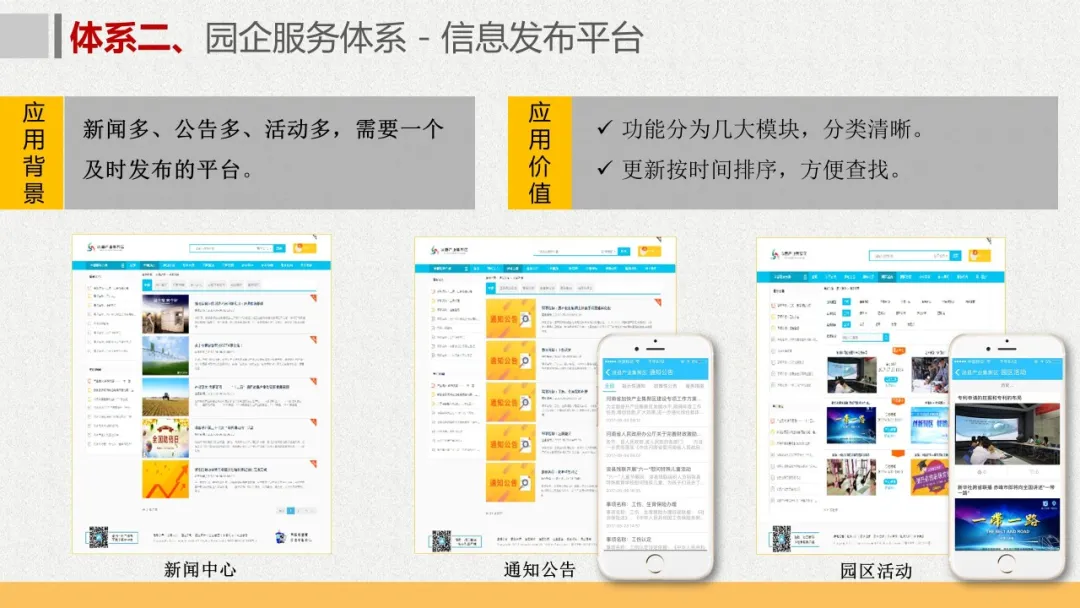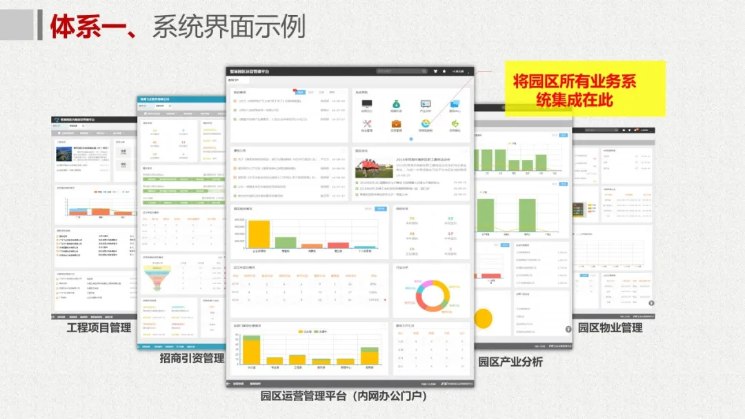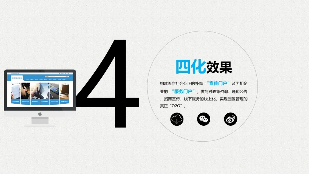 智慧园区理念以及园区一体化的服务需求,充分应用大数据、云服务、物联网、互联网等先进技术,以“园区运营服务”为建设核心,打造基于“一个中心”、“两个门户”、“三个体系”、“四化建设”的科技创新智慧园区。