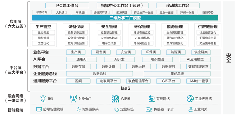 以中国石化的园区为例:中石化作为“世界一流绿色低碳城市型炼化示范企业建设试点”的重点企业,中国石化基于5G如翼定制网模式打造智能石化工厂,将新一代信息技术与石化工业生产过程深度融合,提高了劳动生产率的同时也提升了本质安全环保水平。具体表现在,通过搭建一体化应急指挥中心,实现生产运营业务协同、高效指挥,园区集约化、一体化生产管控能力显著提升。通过利用物联网、三维模型和地理信息技术等,对全厂污染排放点和职业危害监测点进行实时动态监控和预警,实现“三废”达标排放,园区预测预警能力、本质安全环保水平显著提高。