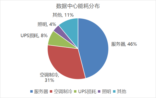 数据中心能耗是指数据中心各种用能设备消耗的能源总和,能耗消耗主要包括:服务器,交换机,空调,配电,安防,照明等系统。据一些数据统计报告,数据中心能耗大致分布如下: