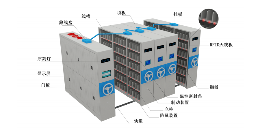 智能化是当今社会发展的大趋势,各行各业都在依靠自身的智能特性紧紧把握着各自市场命脉,物联网、数据分析等信息技术的发展和应用,也大大提升了密集架自身的智慧化特性,通过RFID标签对档案存储信息的标注与识别,可以快速获取档案的位置与编目信息,达到在档案管理系统中检索某一档案,便可快速获取相应位置信息的目的。