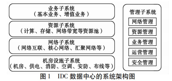 · 管理子系统负责对数据中心的基础设施、网络、计算机资源进行资源管理、系统运行管理,安全管理,并和客户合作进行数据中心承载的各种业务运营管理。