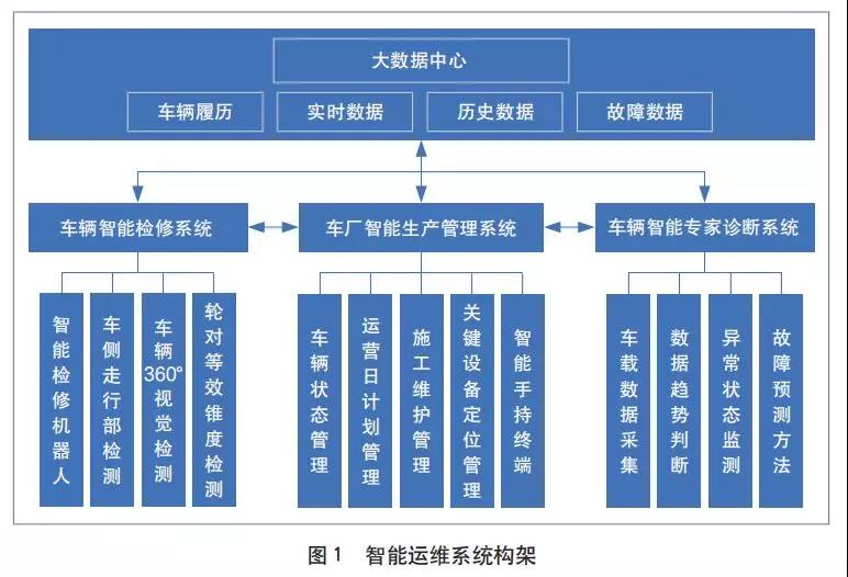 智能运维系统是建立在设备基础上的、以状态修模式为主要发展目标的智能化、数字化系统,其依托大数据中心,结合设备履历数据,并借助实时监控设备,采集和分析城市轨道交通车辆的运行和检修数据,判断设备故障趋势,诊断设备的运用健康状态,从而实现故障预警和分级报警,指导关键设备现场维修作业的智能化管理。