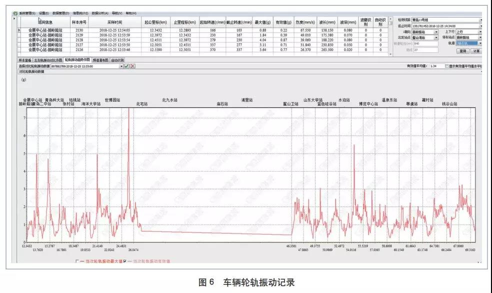 利用车载状态监测设备采集的车辆实时状态数据,并根据系统或部件的历史监控数据,对于专家系统给定阈值内的数据抖动进行变化趋势分析和比对。图 6 显示了车辆走行部轴箱轴承状态监测设备在某运行区间所记录的 2 轴右轨振动数据。在图中 K25+292~K25+400 区 间,最大振动有效值为 7.58g,波磨路段的振动频率为400~450 Hz,未超出系统给定的正常状态阈值,但相较于该轴的历史数据记录,本次振动幅度特别大,因此系统记录下数据变化趋势并发出报警信号,提示检修人员检查该部位走行部状态。