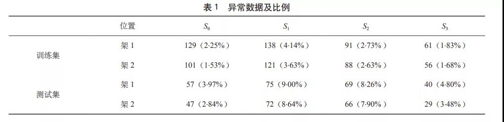车辆智能专家诊断系统会提取影响车辆运行状态的关键数据指标和过程变量,作为故障判定的主要参照,在采集所有的状态数据后,对车辆或系统状态对应时间窗内的所有模拟量数据进行统计,提取区段最大值、最小值、平均值和平均差等不同参数作为区间特征值进行数据重组。然后,将同一车架的同一类车辆或设备状态数据作为学习样本,采用无监督机器学习算法对所得数据进行异常检测。整个数据集按照适当的比例分割为训练数据集和测试数据集,用相应的算法进行验证测试,如表 1 所示。
