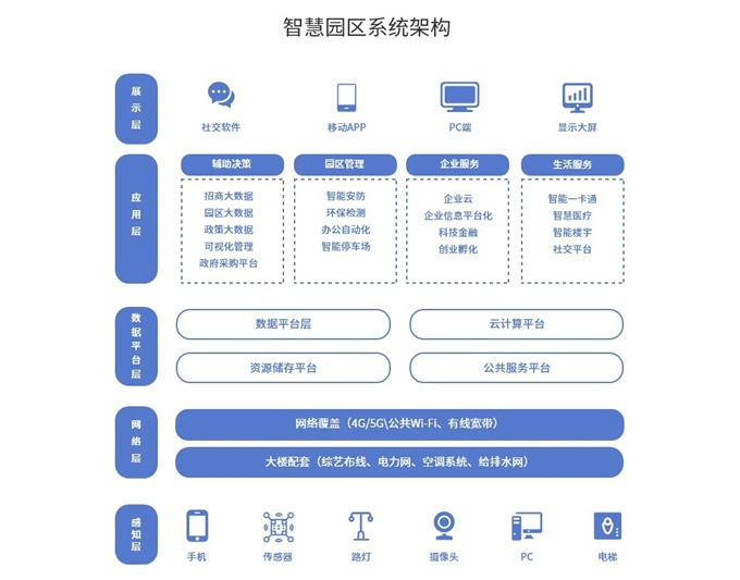 应用层是园区信息服务提供层,涵盖园区各个领域的综合应用体系。基于对大量、高质数据的深层分析和价值挖掘,对政府、企业和居民提供精准、个性的服务。