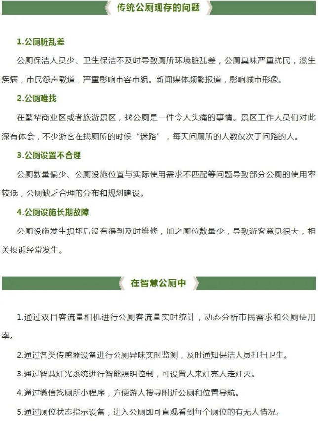 公厕是现代城市不可或缺的重要组成部分,它是城市公共设施一部分,它的智能化是“智慧城市”建设的一个重要标志,也是衡量城市文明程度、管理水平的一项重要指标。公厕数量的多少、服务功能的优劣更是展示城市形象的重要窗口。