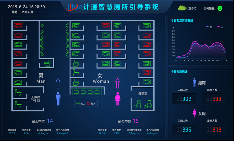 而在现代智慧厕所中,最具特点的就是智慧公厕系统,通过该系统,人们在公厕主入口放置的公厕引导大屏上就可以直观看到公厕男女厕位等设施的分布情况,厕位占用情况环境参数、人流情况等信息。