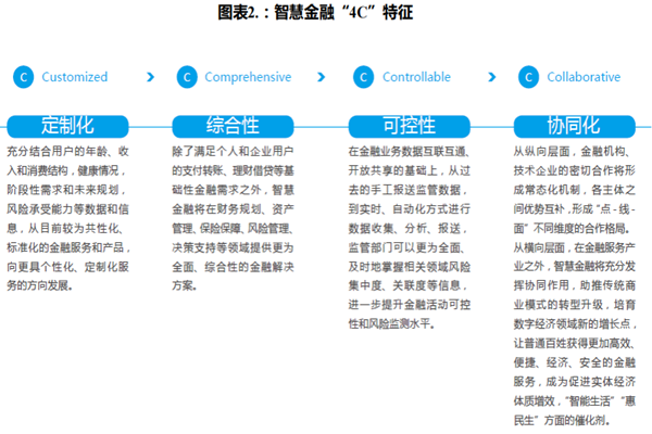 智慧金融的特征主要体现在定制化、综合性、可控性与协同化四个方面: