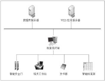 智能档案管理系统主要由RFID电子标签、馆员终端设备、智能安全检测门等设备构成。总体结构图如图2所示。RFID电子标签作为信息存储媒介并粘贴在档案袋上,在其芯片中存储该档案的基本信息和借用、归还记录;利用RFID读写设备与后台数据库管理系统相配合,可以实现档案的智能化管理。同时,出入口处的智能安全检测门有自动防盗和档案出入库确认功能。系统网络的拓扑结构如图3所示。