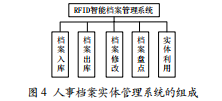 经过充分的调研和详细的分析,智能档案管理系统主要包括档案入库、档案出库、档案盘点、档案修改、实体利用等模块,图4所示是一个人事档案实体管理系统的组成图。