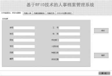 读卡器接收到RFID标签卡的卡号数据之后,自动对比人事档案表格中的卡号数据。如果卡号不存在人事档案表格中,就自动跳转到档案入库的选项卡中,然后通过在输入框输入数据、点击“添加”将需要的档案数据添加进入人事档案表格。