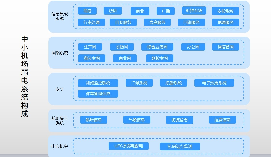 我国民用机场的分类定义是多样化的,根据《关于修订民航中小机场补贴管理暂行办法的通知》(财建〔2020〕93号),按照支持性补贴政策中的分类定义,中小机场是指年旅客吞吐量在200万人次及以下的民用机场。中小机场主要特点是机场数量众多、吞吐量小,其机场弱电系统规模小,但种类与大型机场基本相同,由两部分构成(如图1所示),一是保障机场信息系统正常运行的中心机房,另一部分是中心机房之外的业务应用系统和终端设备等。离港、安检等信息集成系统,是机场旅客服务的信息中枢,航班数据与各个信息业务系统、终端互联互通。