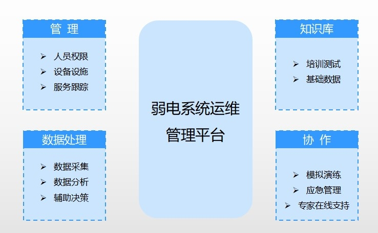 弱电系统运行良好,前提是一系列硬件设施设备及软件系统稳定运行。弱电系统运维平台收集设施设备的基本数据,是定期运维、自动生成预防性巡检的基础数据。随着物联网技术的普及,传感器种类越来越多、价格越来越低,更多的设施设备通过物联网交换数据,故障和潜在问题将更容易被发现和识别。