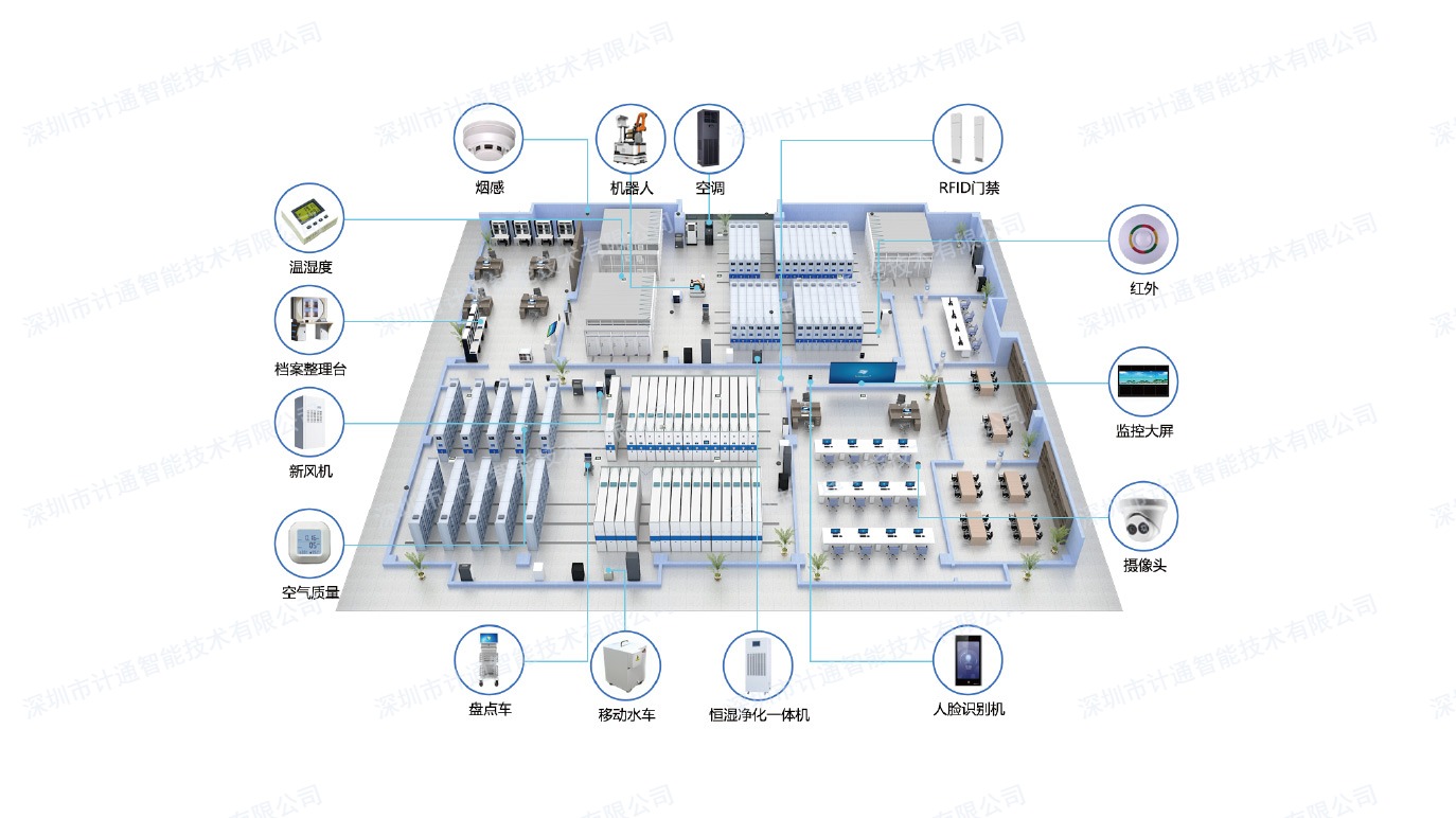计通智能档案库房智能环境管理系统通过采集库房环境温湿度、空气质量等数据,结合空调、加湿/除湿机、消毒净化机、新风机等设备,对库房内恒温恒湿与空气净化进行管理和控制,实现环境参数变化与设备间的智能联动控制。同时集成安全防范(如门禁、视频、红外入侵、消防等)、智能灯控等子系统,全方位保障档案库房和实体档案的安全。