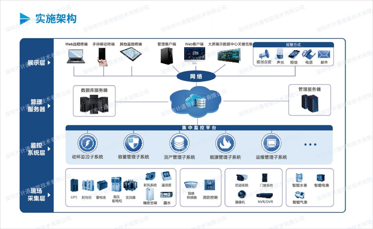 计通智能数据中心基础设施管理平台融合动环监控、资产管理、容量管理、能源管理、运维管理等多个子系统,进行统一的运维管理,帮助数据中心管理者高效、智能掌控数据中心的整体运行情况。有利于用户整体掌控数据中心动力环境、资产、容量、能耗...实现数据中心的全面监控、智能预警、高效管理、节能减排等等,从而提高数据中心资源利用率和管理效率。