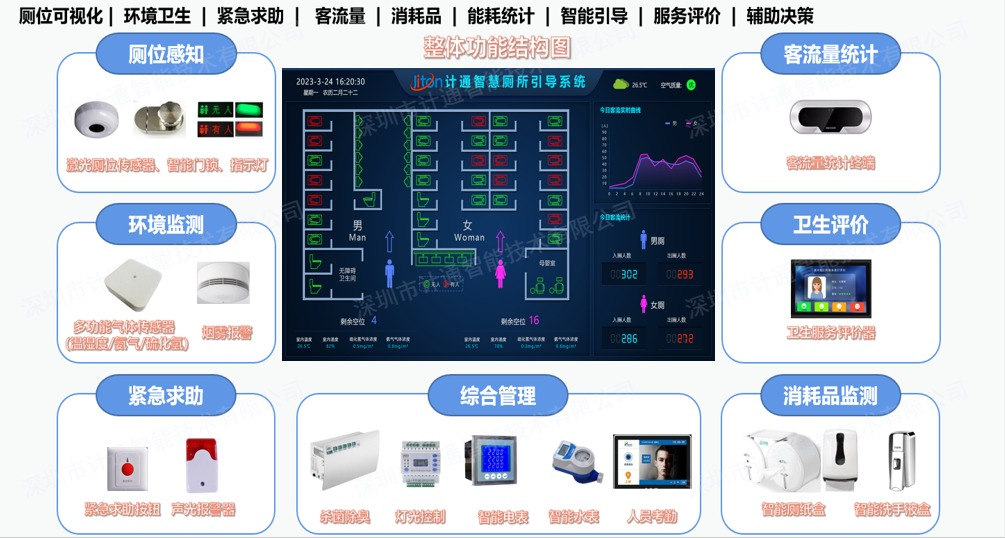 通过“物联网+厕所”思维,运用厕所大数据匹配不同场景的智能化需求,提供厕所异味监控、节水节能、服务指引及其他个性化需求,实现了对厕所的智慧、精细管理。