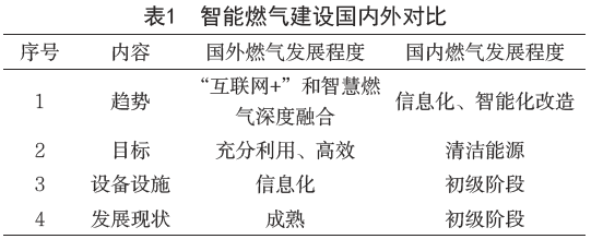 如下表1中所示,国内城镇燃气企业在智能化建设方面尚处于发展阶段,而国外发达国家已进入成熟阶段,在发展趋势方面国外已进行互联网和燃气深度融合,而国内处于改造阶段,在智能设备方面已体现信息化,国内尚处于起步阶段。