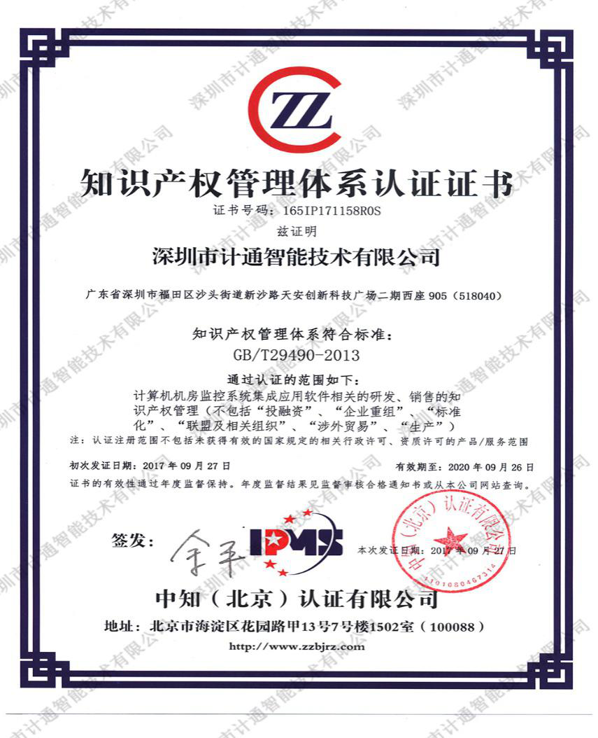 2017年9月27日,深圳计通迎来了振奋人心的消息——深圳市计通智能技术有限公司以其完整规范的知识产权管理流程及卓有成效的深入实施,顺利取得中知(北京)认证有限公司颁发的《知识产权管理体系认证证书》。这意味着计通在知识产权领域获得了重要认可,计通在知识产权方面进一步规范、综合竞争力得到进一步提升。