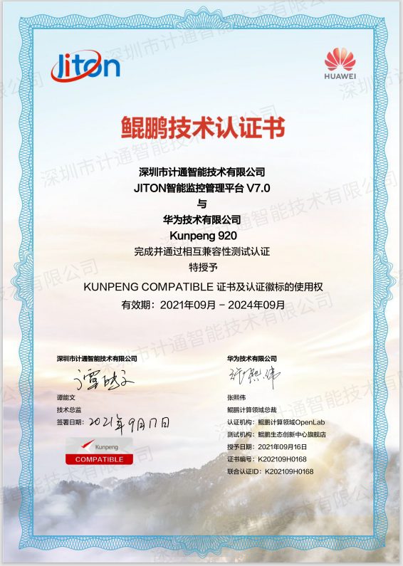 ·HUAWEI COMPATIBLE证书致力于第三方厂商产品与华为互操作和互联互通测试以保障双方产品能够兼容运行,为客户提供既定的产品功能。它的获取表明“JITON智能监控管理平台V7.0”具有业内认可的高兼容性、实用性和稳定性。